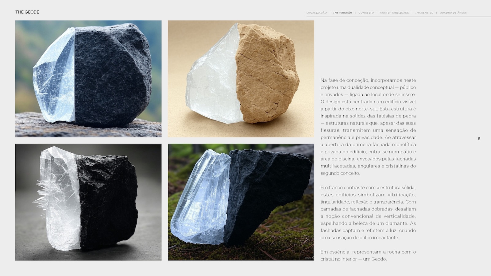 Upon passing through the opening of the building’s first monolithic and private façade, one enters a courtyard and pool area, enclosed by the multifaceted, angular, and crystalline façades of the second concept.