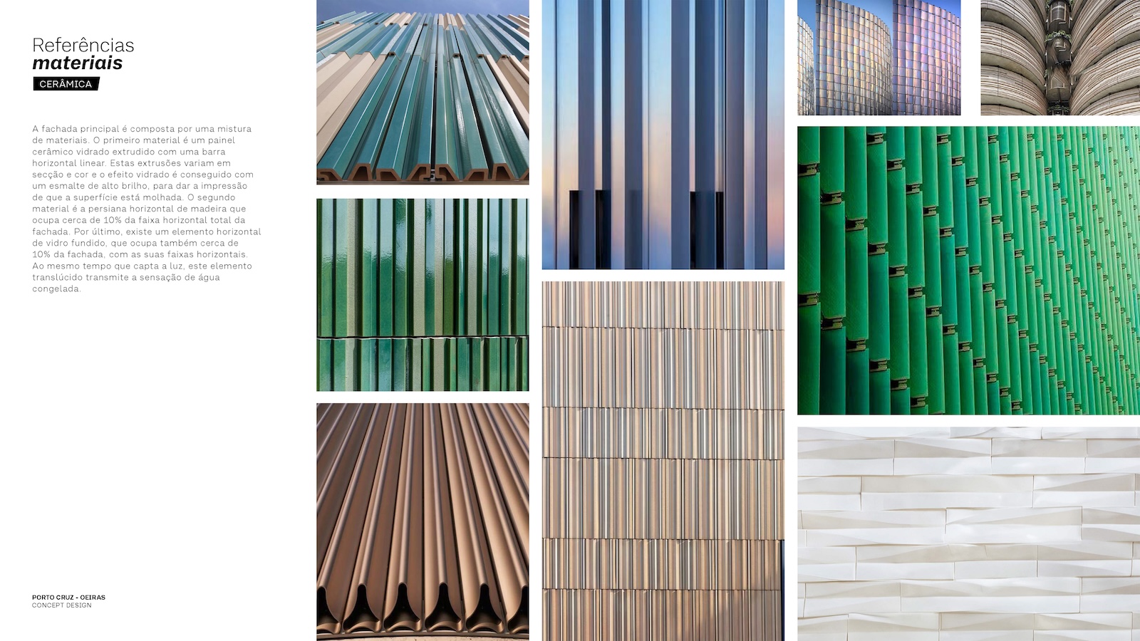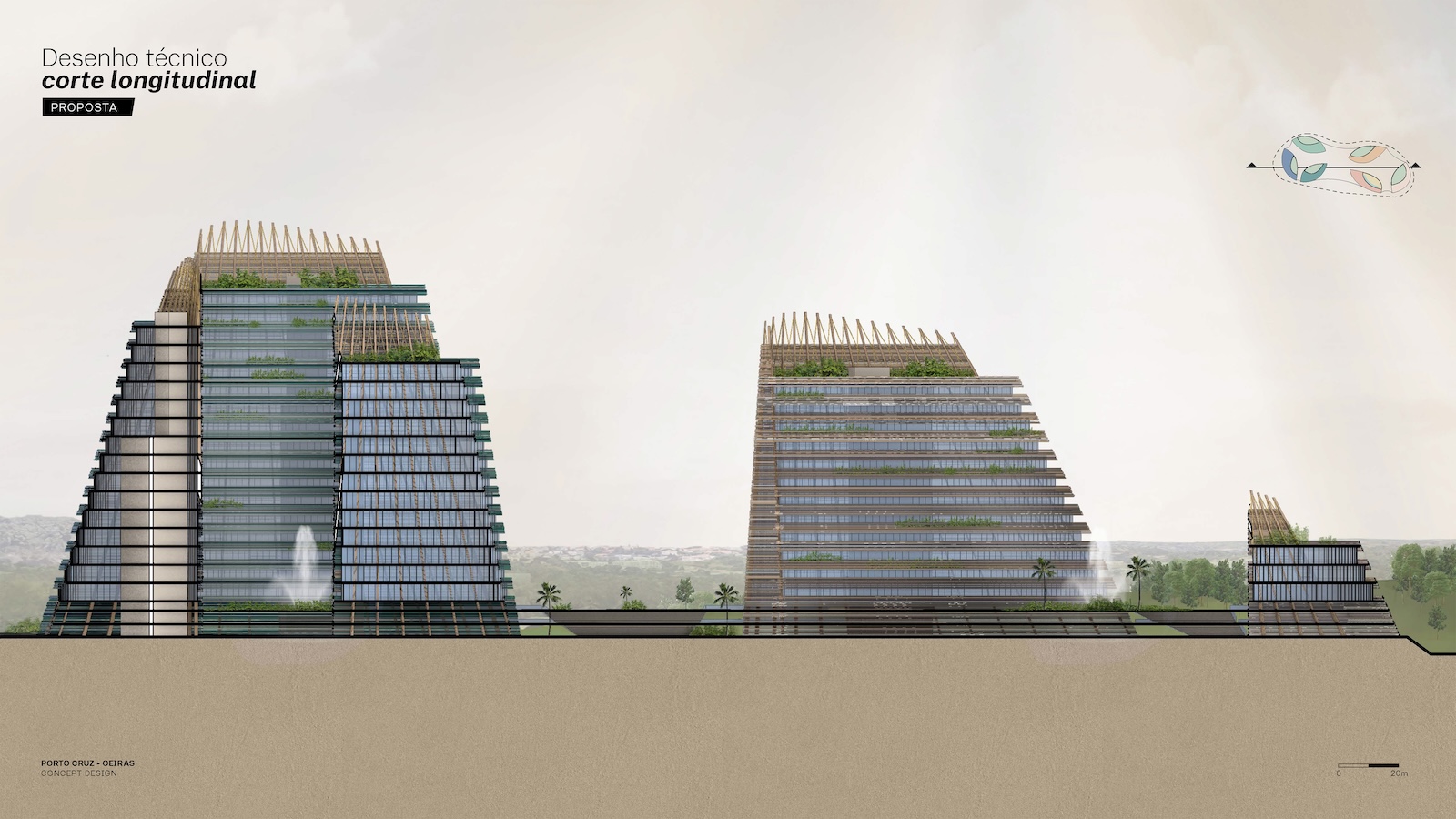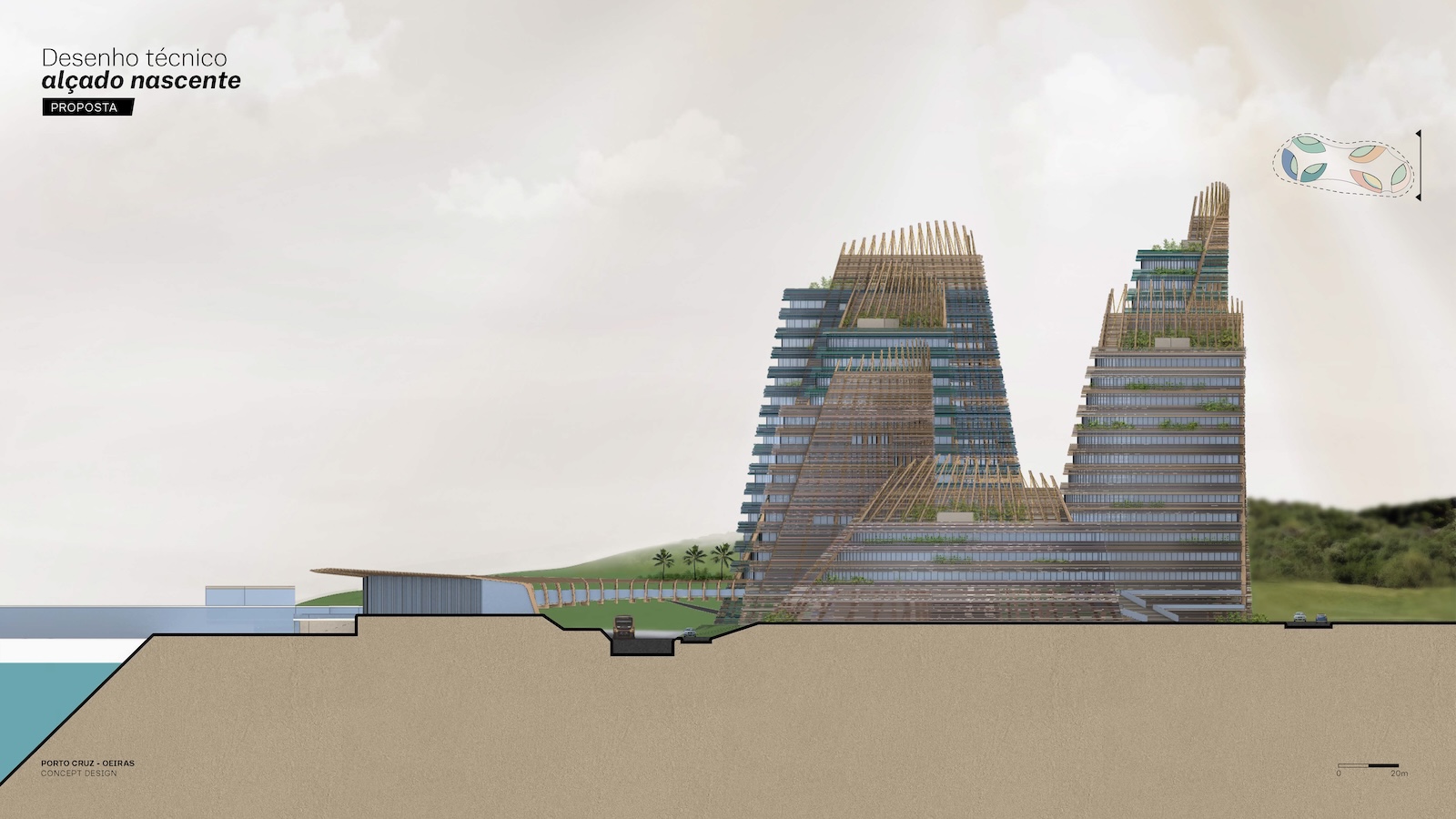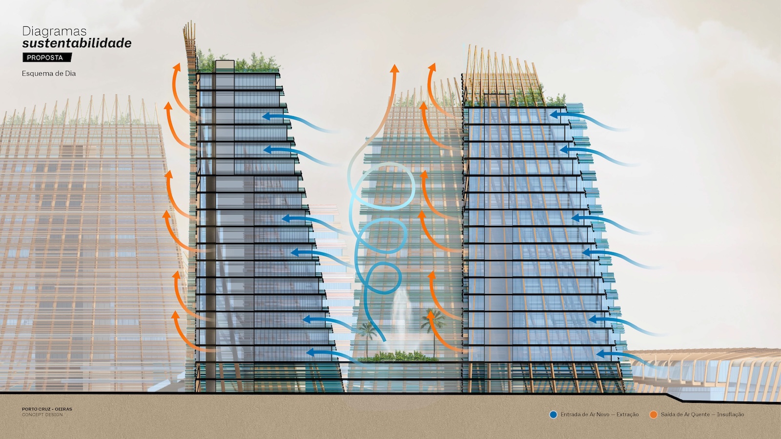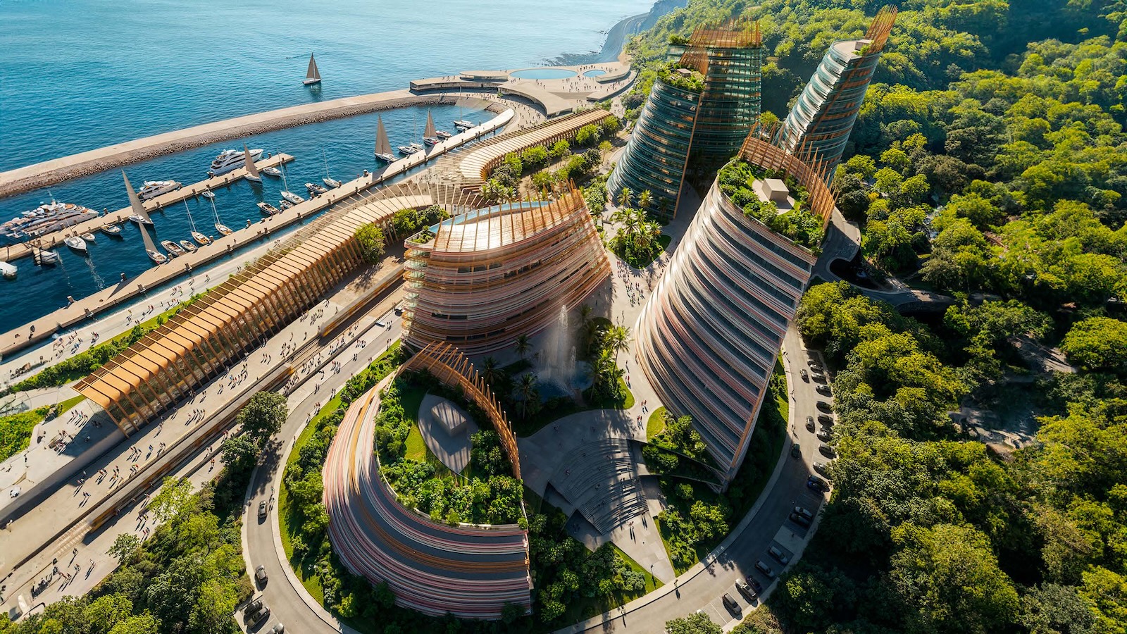 Landscape and architecture intertwine to create a fluid and harmonious experience. The façades extend to ground level, enveloping the parking levels and allowing the buildings to appear as if they rise directly from the earth. A landscaped platform sits above the parking structure, featuring two public plazas with fountains and greenery, and a colorful central square that connects to a pedestrian bridge leading toward the marina. The main façades combine materials such as high-gloss extruded glazed ceramic panels, timber louvers, and cast glass bands that capture and diffuse light like frozen water. Vertical glued-laminated timber beams anchor the shell-like structures and recall the masts of great sailing ships. Beyond their visual elegance, these wooden frames enhance privacy, filter sunlight, and reduce the project’s carbon footprint—reinforcing the design’s sustainable and poetic dialogue between sea, structure, and light.