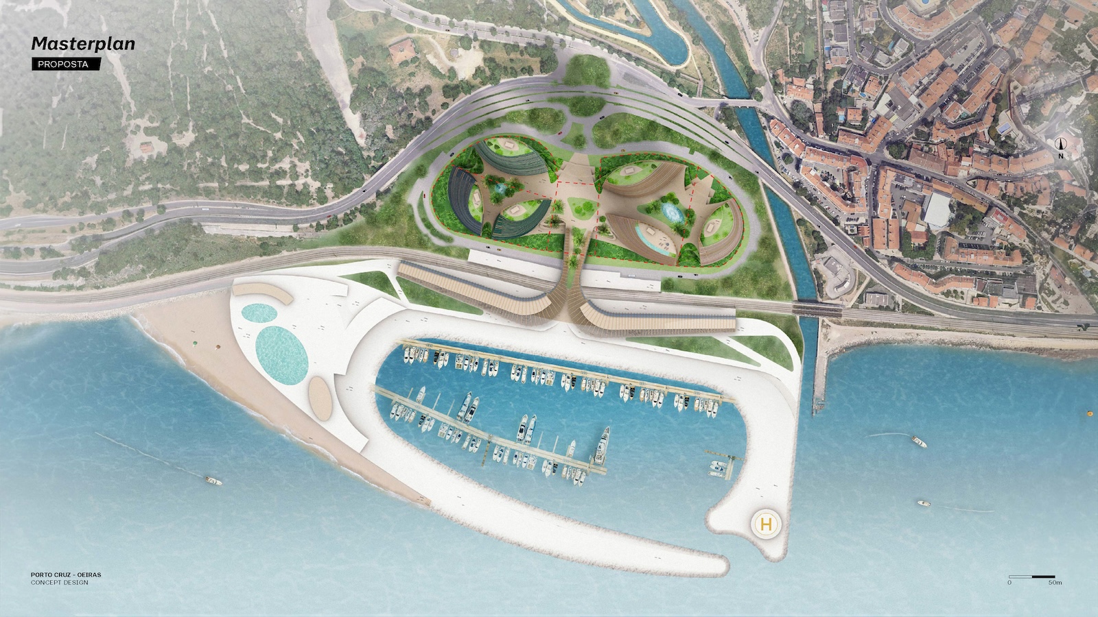 This project is a collaboration with S+A. The design takes inspiration from the graceful navigation of large sailboats and the elegant forms they create as they move across the sea. The buildings rise like a fleet of vessels, their fluid, curving silhouettes evoking the tension of sails filled by the wind—a sense of speed, lightness, and direction. Positioned near the shoreline, they mirror the poetic relationship between sea and sail, appearing as great ships with their masts and sails unfurled. The façades draw from the natural beauty of two distinct seashells: the deep blue mussel and the softly pink nautilus. These tones form the chromatic identity of the two building clusters, connecting the architecture to the coastal character of the Atlantic and creating a natural bond with the riverside landscape.