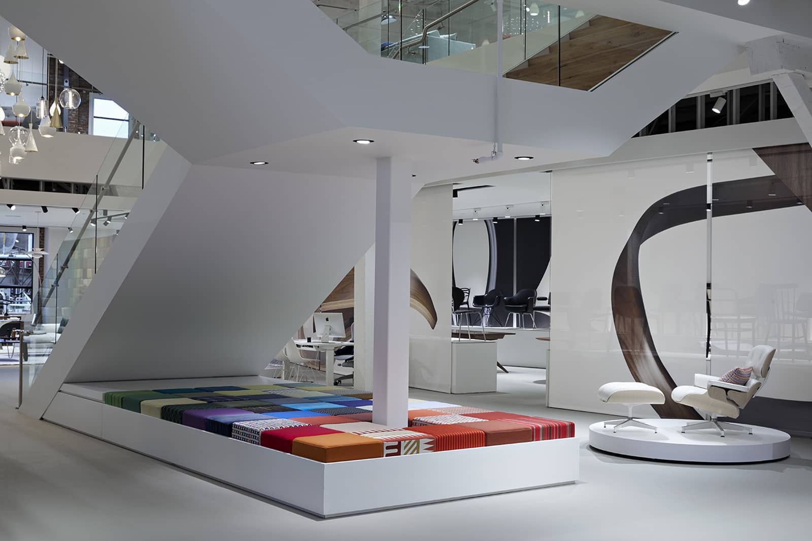 Located in the Stagecraft Building, a circa 1890 two-story brick warehouse that originally served as a distribution center for pottery and housewares, DFA re-adapted the 26,000 sq. ft. space into a multi-level experiential showroom, juxtaposing the 19th century with the 21st via clean white lines and displays in line with DWR’s branding (also by DFA). Specifically, the New York City-based design team was tasked with transforming the unleveled floor to structurally take on heavy loads. Additionally, the vast open space required extensive engineering to balance the building’s air pressure within the limited framework of the existing HVAC system installed by the building owner.