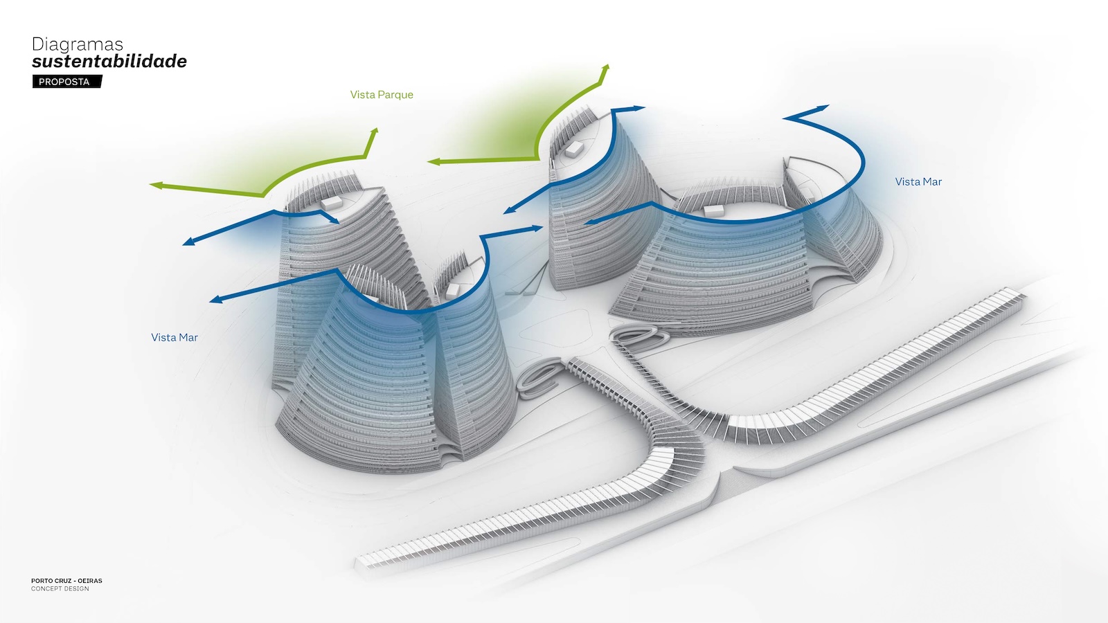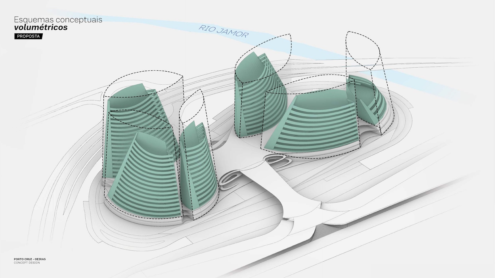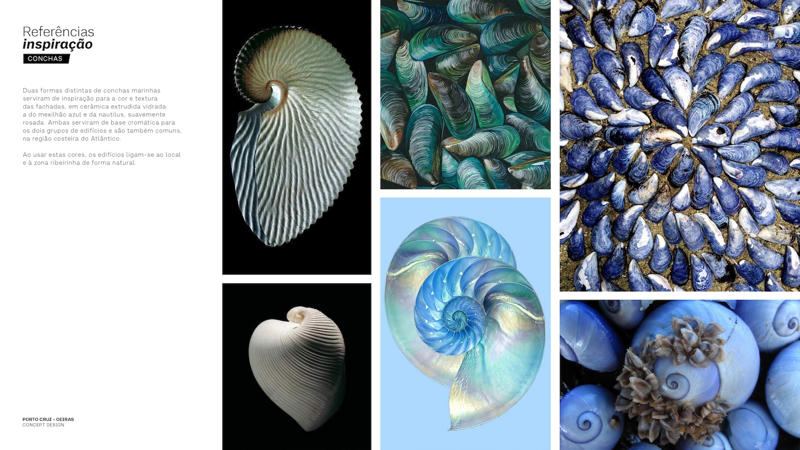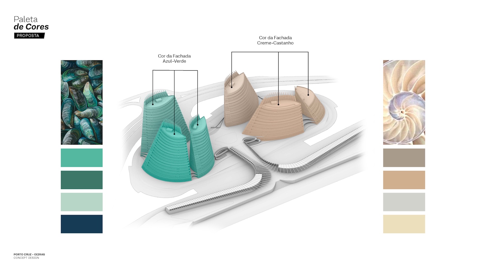 This project is a collaboration with S+A. The design takes inspiration from the graceful navigation of large sailboats and the elegant forms they create as they move across the sea. The buildings rise like a fleet of vessels, their fluid, curving silhouettes evoking the tension of sails filled by the wind—a sense of speed, lightness, and direction. Positioned near the shoreline, they mirror the poetic relationship between sea and sail, appearing as great ships with their masts and sails unfurled. The façades draw from the natural beauty of two distinct seashells: the deep blue mussel and the softly pink nautilus. These tones form the chromatic identity of the two building clusters, connecting the architecture to the coastal character of the Atlantic and creating a natural bond with the riverside landscape.