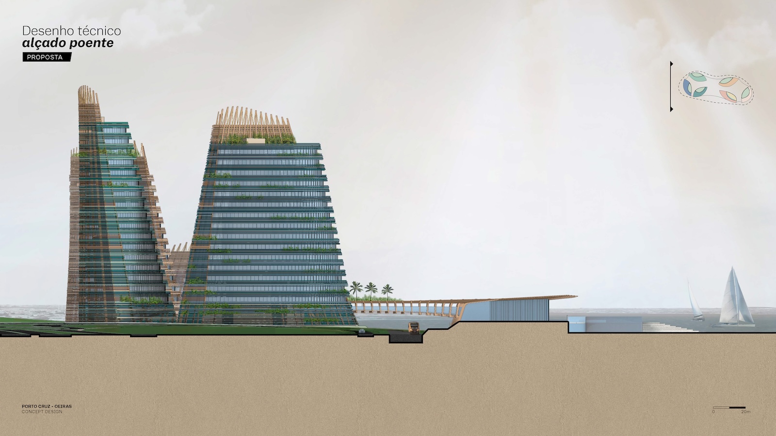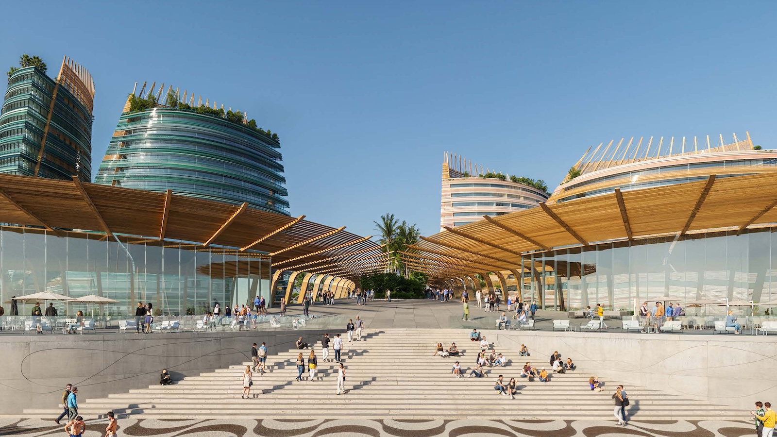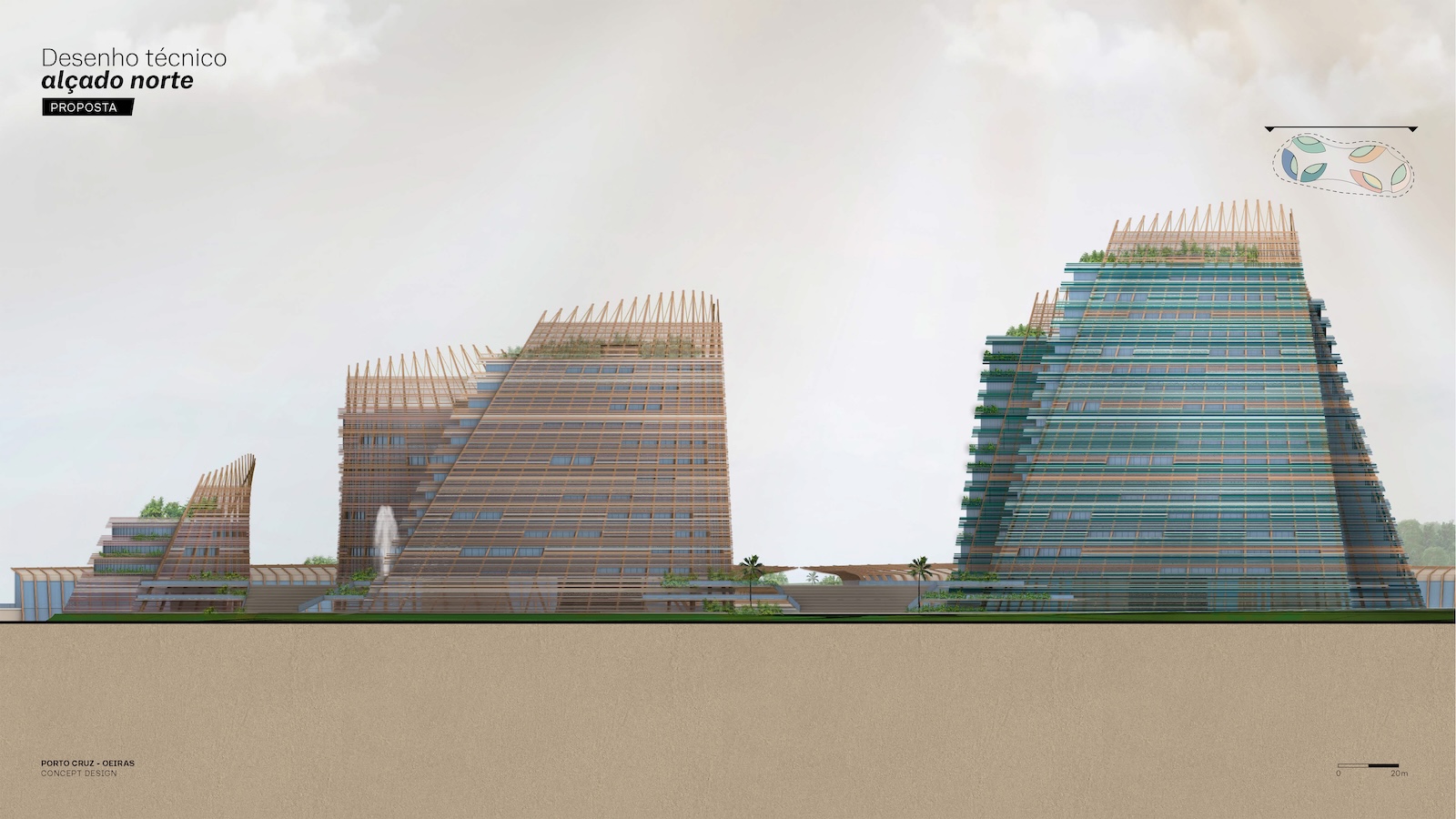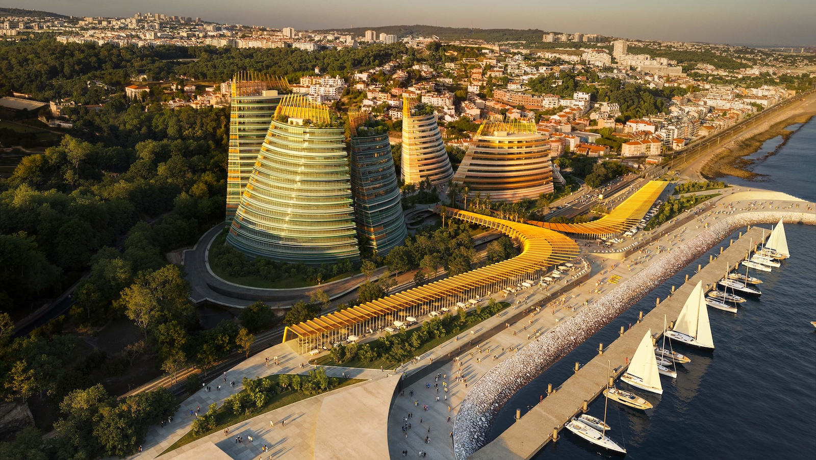 Landscape and architecture intertwine to create a fluid and harmonious experience. The façades extend to ground level, enveloping the parking levels and allowing the buildings to appear as if they rise directly from the earth. A landscaped platform sits above the parking structure, featuring two public plazas with fountains and greenery, and a colorful central square that connects to a pedestrian bridge leading toward the marina. The main façades combine materials such as high-gloss extruded glazed ceramic panels, timber louvers, and cast glass bands that capture and diffuse light like frozen water. Vertical glued-laminated timber beams anchor the shell-like structures and recall the masts of great sailing ships. Beyond their visual elegance, these wooden frames enhance privacy, filter sunlight, and reduce the project’s carbon footprint—reinforcing the design’s sustainable and poetic dialogue between sea, structure, and light.