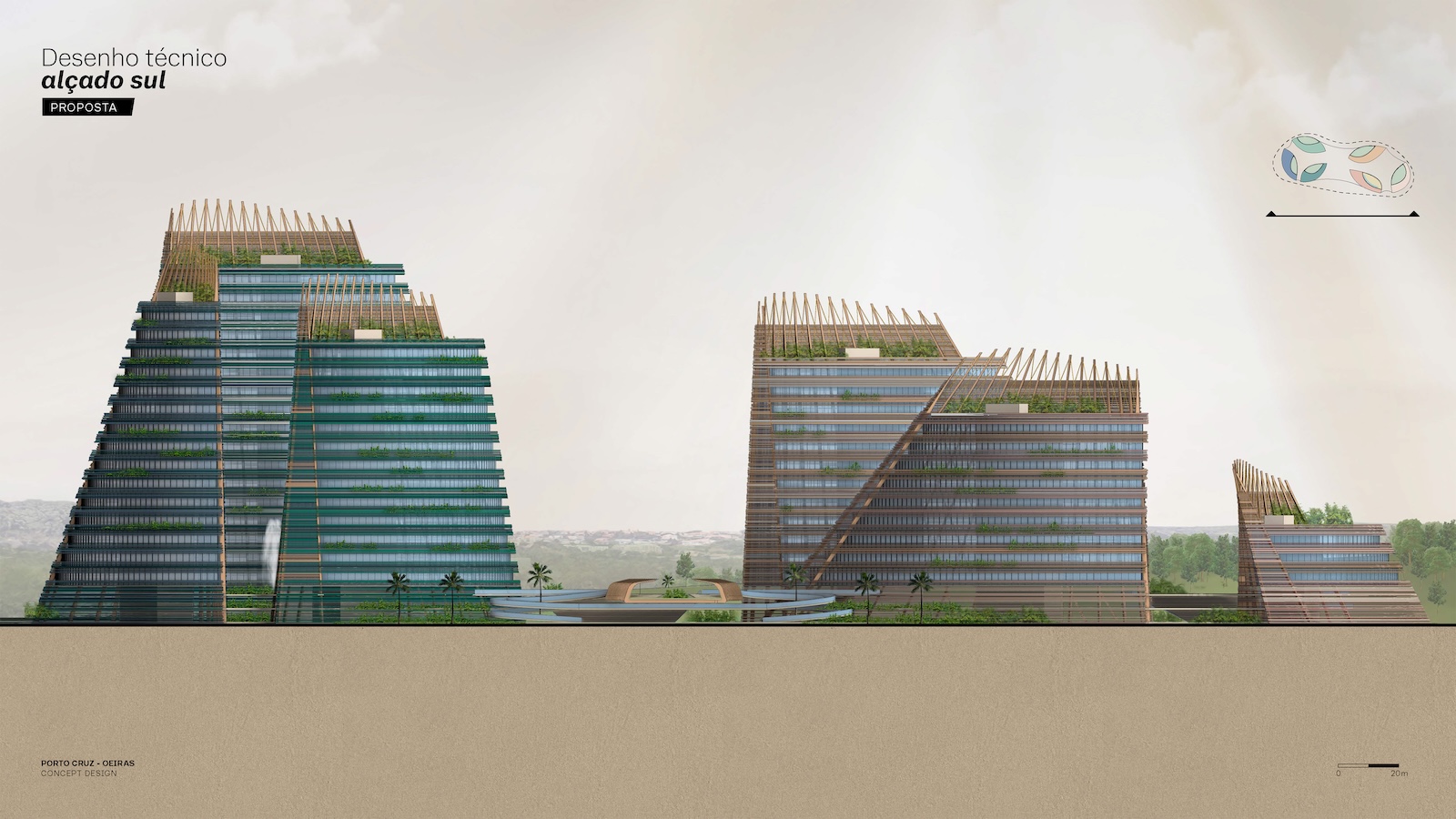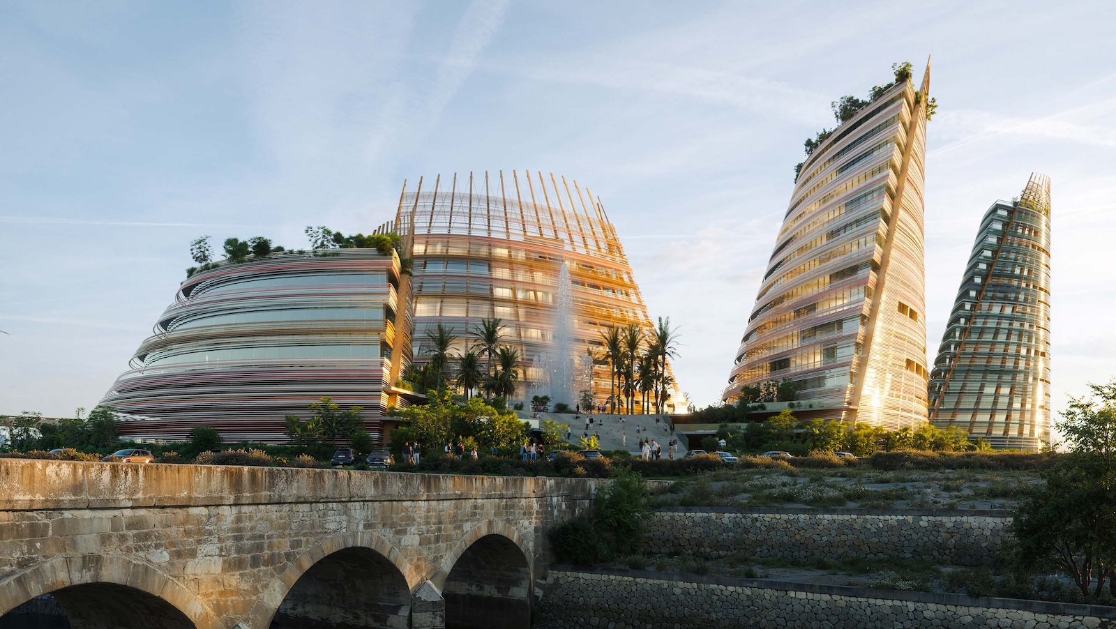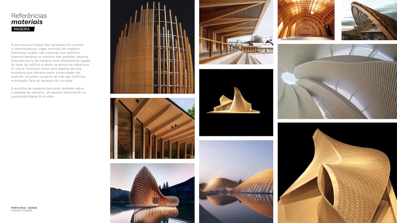 Landscape and architecture intertwine to create a fluid and harmonious experience. The façades extend to ground level, enveloping the parking levels and allowing the buildings to appear as if they rise directly from the earth. A landscaped platform sits above the parking structure, featuring two public plazas with fountains and greenery, and a colorful central square that connects to a pedestrian bridge leading toward the marina. The main façades combine materials such as high-gloss extruded glazed ceramic panels, timber louvers, and cast glass bands that capture and diffuse light like frozen water. Vertical glued-laminated timber beams anchor the shell-like structures and recall the masts of great sailing ships. Beyond their visual elegance, these wooden frames enhance privacy, filter sunlight, and reduce the project’s carbon footprint—reinforcing the design’s sustainable and poetic dialogue between sea, structure, and light.