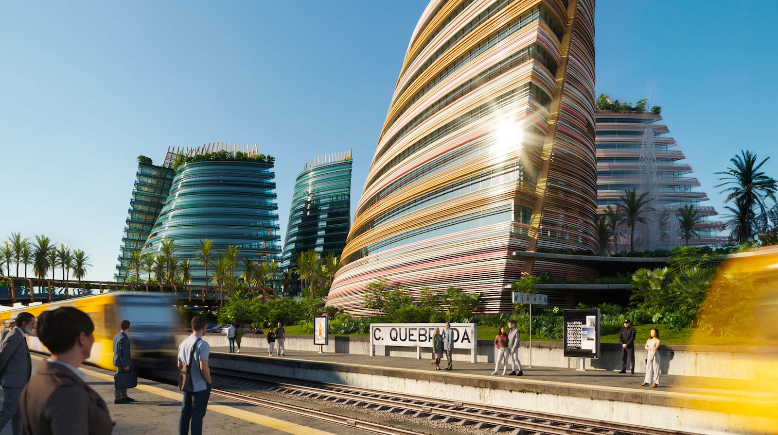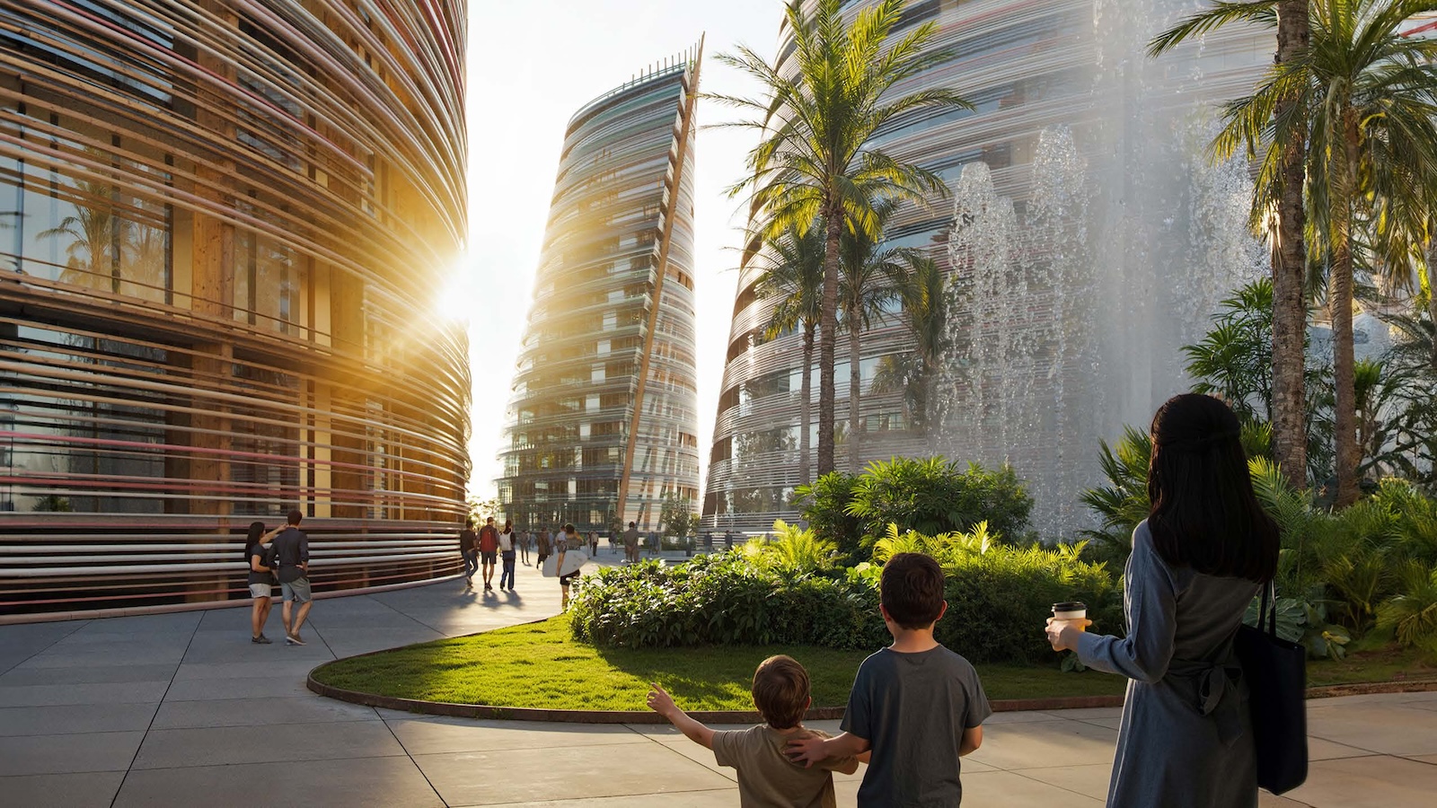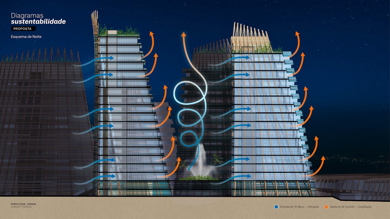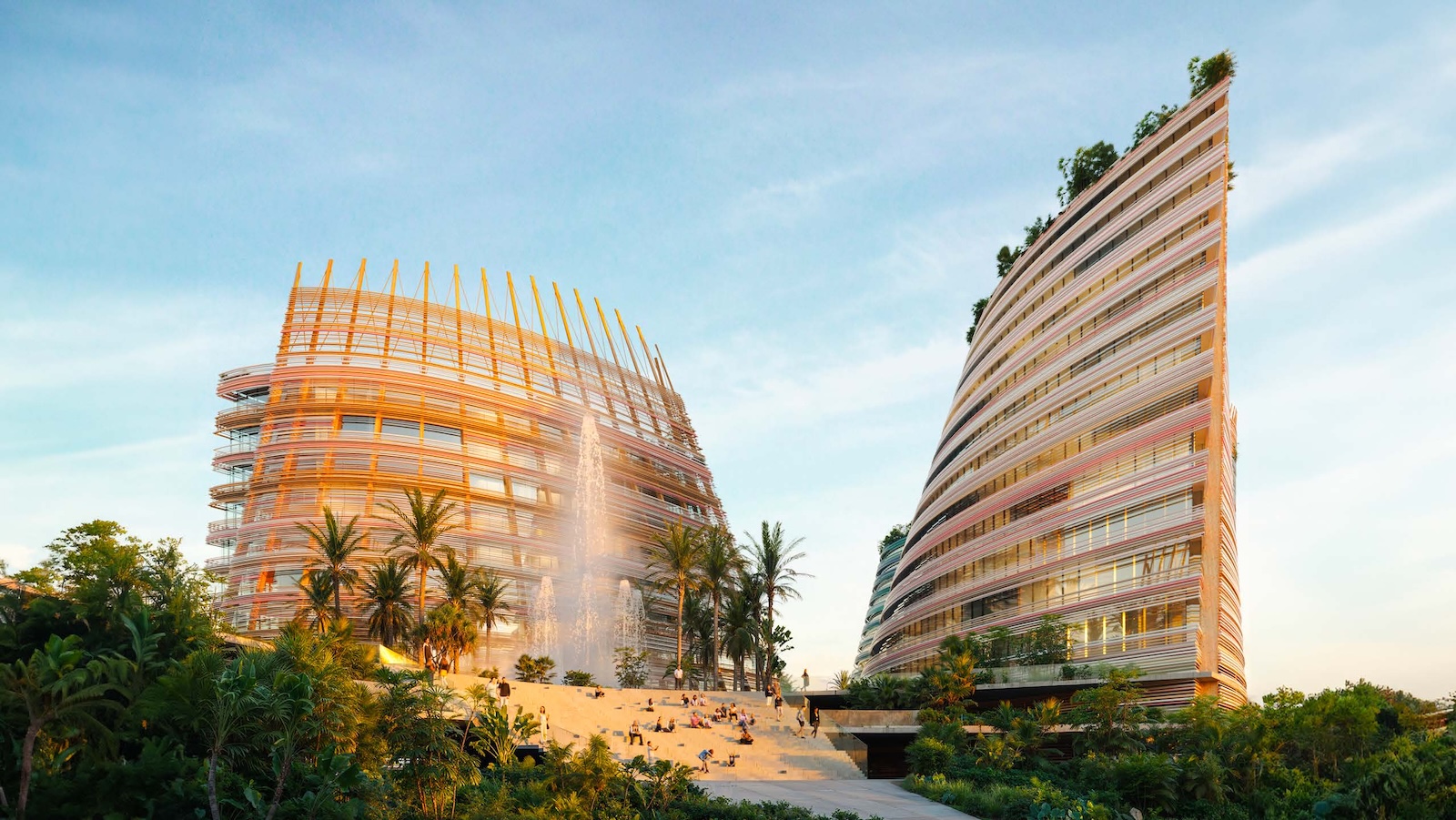 Landscape and architecture intertwine to create a fluid and harmonious experience. The façades extend to ground level, enveloping the parking levels and allowing the buildings to appear as if they rise directly from the earth. A landscaped platform sits above the parking structure, featuring two public plazas with fountains and greenery, and a colorful central square that connects to a pedestrian bridge leading toward the marina. The main façades combine materials such as high-gloss extruded glazed ceramic panels, timber louvers, and cast glass bands that capture and diffuse light like frozen water. Vertical glued-laminated timber beams anchor the shell-like structures and recall the masts of great sailing ships. Beyond their visual elegance, these wooden frames enhance privacy, filter sunlight, and reduce the project’s carbon footprint—reinforcing the design’s sustainable and poetic dialogue between sea, structure, and light.